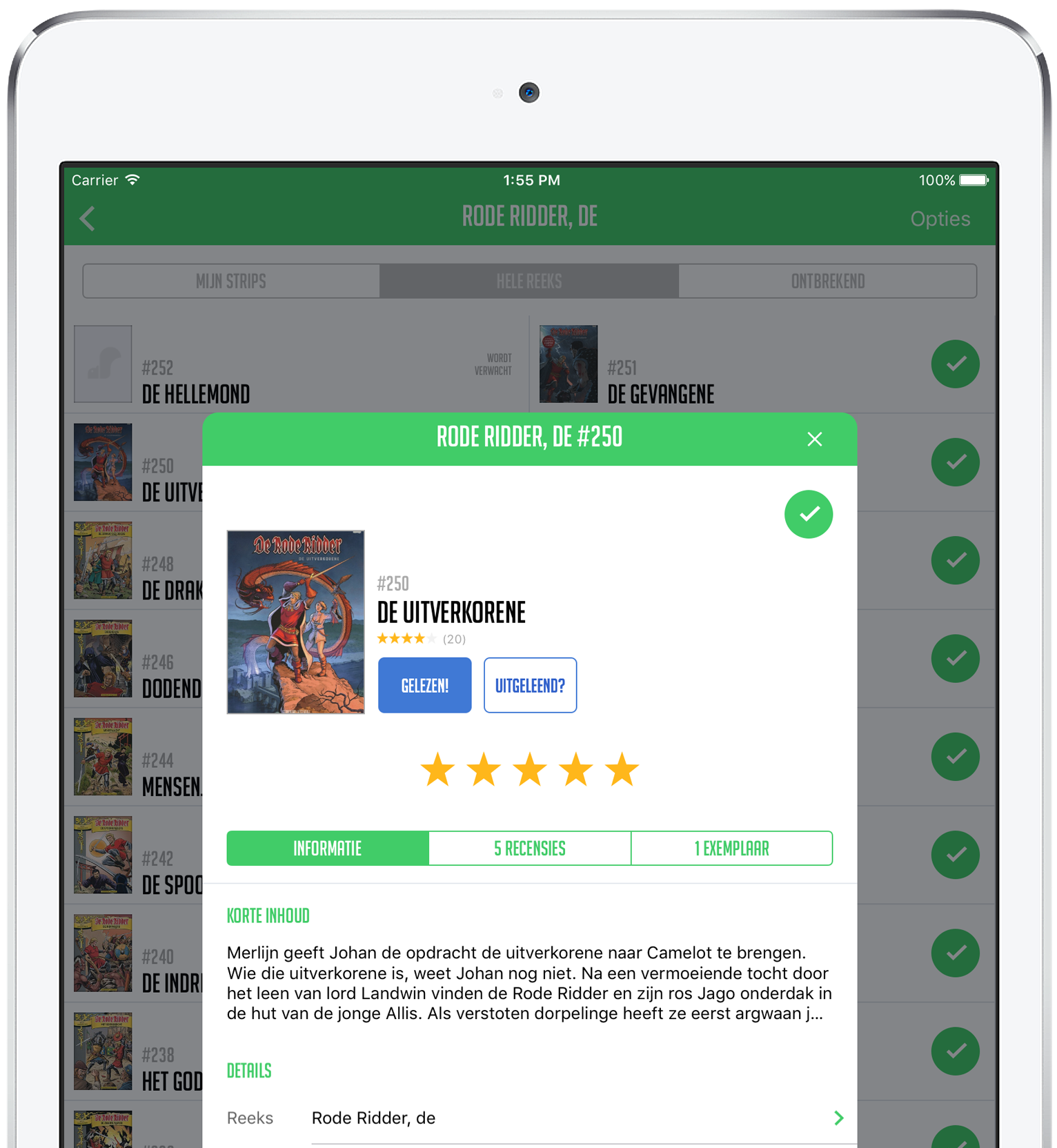 De korte inhoud, uitgever, schrijver en tekenaar. Naast deze informatie kan je de strip hier toevoegen aan je verzameling of aan je verlanglijstje. Je kan hem ook aanduiden als gelezen, een waardering geven of bijhouden aan wie je de strip uitgeleende.